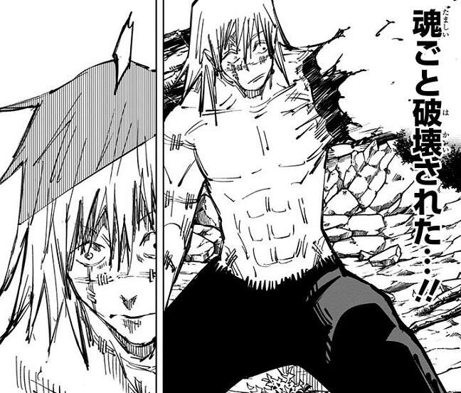 与幸吉は今まで自分を縛ってきた年月、それで得た呪力を使いながら真人を攻めますが、真人は与幸吉の攻撃など意に介さず、攻めの姿勢を崩しません。与幸吉は攻め続ける真人の隙を突いて、真人の魂ごと破壊する攻撃を繰り出し、真人にダメージを与えます。さらに与幸吉は呪力を使って攻撃し続けますが、真人は「自閉円頓裹」を展開し与幸吉を殺そうとします。