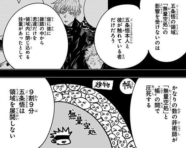 五条は無下限呪術を解いて、呪力操作のみで漏瑚を攻撃します。それを見た花御は五条の狙いは自分でなく漏瑚と考え、「領域展延」を解き術式で五条を攻撃しようとします。しかし、五条が無下限呪術を解いたのは漏瑚や花御に「領域展延」を解かせるためで、花御が「領域展延」を解くと五条は一気に花御に近づき、花御の弱点を容赦なく攻撃します。