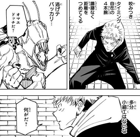 虎杖が向かった東京メトロ 明治神宮前駅 地下2階には、蝗GUYというバッタの呪霊が“帳”の基となる呪符が巻かれた杭を守っていました。蝗GUYは術式が使えませんが、強さは準1級以上で4本腕を使い虎杖を追い詰めようとします。しかし虎杖は既に1級術師レベルに達していて、蝗GUYを圧倒、蝗GUYを祓った後は“帳”の基を破壊します。