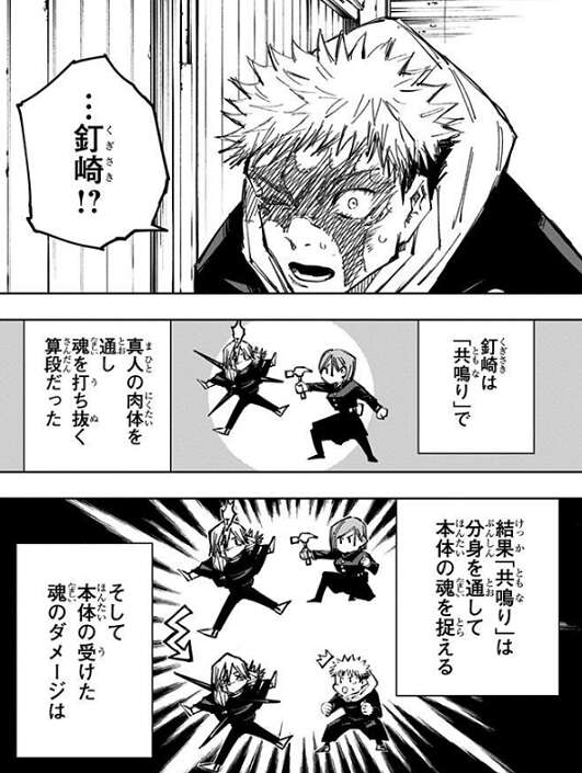 釘崎が真人に「共鳴り(ともなり)」を撃ち込むと、真人の分身を通して真人の本体にダメージが及びます。さらに本体の受けた魂のダメージは、再び分身へとフィードバックされ、その現象を見ていた釘崎は自分が遭遇したのが真人の分身だと気付きます。釘崎は真人の分身は術式が使えないと気付き、積極的に真人を攻撃します。