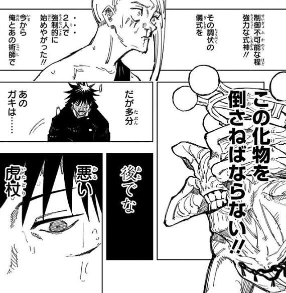 そして、歴代十種影法術師の中にコイツを調伏出来た者はいない、と伏黒は言うと八握剣異戒神将魔虚羅(やつかのつるぎいかいしんしょうまこら)を呼び出し、重面春太を強制的に調伏の儀式に参加させます。その後、伏黒は死に重面春太は魔虚羅と強制的に戦うことになります。