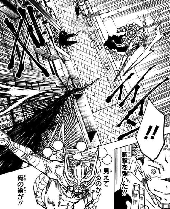 調伏の儀を無かったこととする為、宿儺は魔虚羅を倒そうとします。しかし、宿儺が斬撃を魔虚羅に与えても、後ろの法陣が回ると魔虚羅の傷は癒えてしまいます。さらに、後ろの法陣が回った後 魔虚羅は宿儺にとって相性の悪い特性へと変化し、宿儺を追い詰めます。