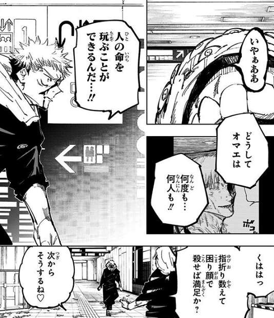目の前で七海を真人に殺された虎杖は、真人を殺そうとしますが「撥体」で攻撃を防がれてしまい、反撃をくらってしまいます。人の命を弄ぶ真人に対して虎杖は激怒しますが、真人から、オマエは俺だ、そいつを認めない限りオマエは俺に勝てない、と言われます。虎杖は怒りで我を忘れないように、冷静に七海の最後の言葉を思い出そうとします。