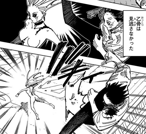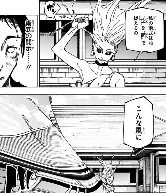 乙骨は黒沐死の頭部から、反転術式で正のエネルギーを注ぎ込み、一気に黒沐死を倒します。しかし、今度は過去の術師・烏鷺亨子がいきなり現れ、空間を歪めて攻撃し、乙骨は吹っ飛ばされてしまいます。烏鷺は自ら術式を開示し、私の術式はね、“空”を“面”で捉えるの、と言い、乙骨が見ている前で空間を歪めて見せます。