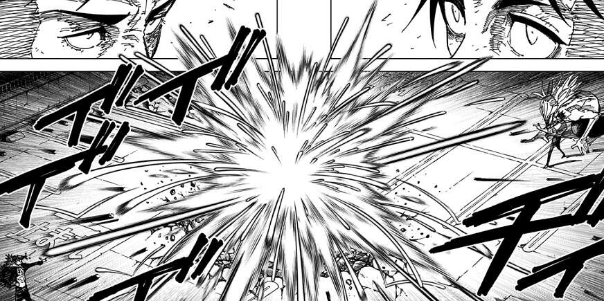 烏鷺は石流のグラニテブラストをくらい意識を失い、残った乙骨と石流は一騎打ちの形となります。乙骨は呪力の最大出力でやや石流に劣るため、より早く呪力を溜め石流が最大出力に達する前に放出しようとします。しかし、石流の400と余年の渇望、渇きに比例した熱い眼差しが乙骨の心を解かします。