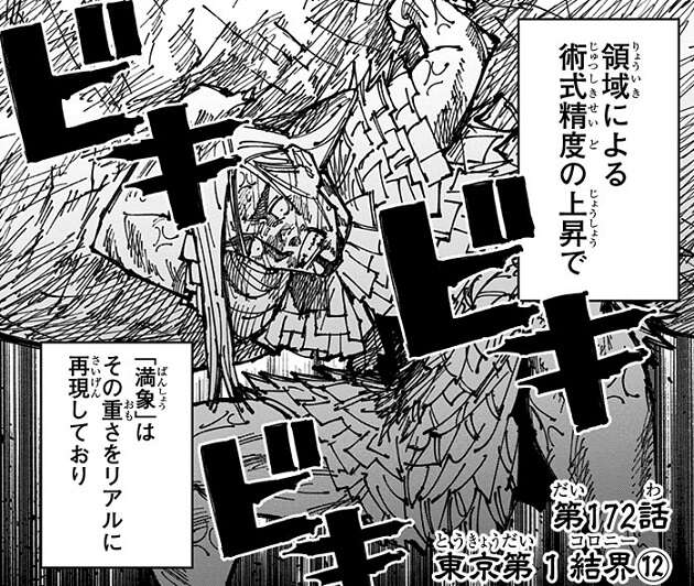 伏黒は影に吸い込まれた乗用車3台分の重さ、約2.4トンの負荷がかかりますが、レジィにも「満象」の重さの負荷がかかり、お互い圧殺寸前の状況に陥ります。レジィはお互い動けない状況を打破すべく、“とっておき”を発動しようとしますが、満象の重さに耐えられなくなり影の中に落ちて行ってしまいます。