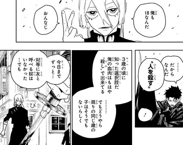 一方、昼彦はチヒロが戦る気になって嬉しいようで、同じ18歳だとチヒロに教えます。さらに昼彦は3歳の頃に“人を殺す”という選択肢を知り、俺の血肉は“殺し”で出来ているとチヒロに言います。しかし、周りの同じ年の子はそうでもないらしく、今日までずっと…対等に友と呼べる奴はいなかった、と昼彦は語ります。