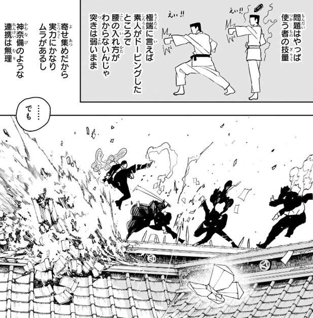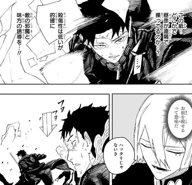 しかし、今チヒロと戦っている3人は昼彦が選定した野良の妖術師で腰の入れ方はわかっている部類のようで、連携もそれなりに出来るようです。一方、チヒロは昼彦の紙の妖術によって視界を的確に邪魔され、さらに味方の妖術師の誘導もしています。今、チヒロと3人の妖術師は劇場の屋根で戦っていますが、昼彦は味方の妖術師を劇場の下に落ちてくるような攻撃をするように紙の妖術で指示します。