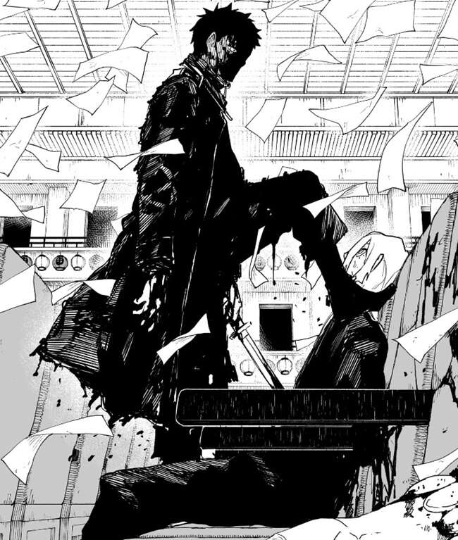 さらに紙を鶴に変えてチヒロを攻撃、鶴は紙で出来ていますが人体を貫くほどの威力でまともに何度も食らうとチヒロでも無事でいられなさそうです。チヒロが観客を気にして動けない様子を昼彦は紙を通じて感知し、チヒロの妖刀の能力を分析します。妖術を吸収する“猩”(あか)がありますが、昼彦は妖術でも物理的なものは消失できないと分析します。さらに衝撃波を放つ“涅”(くろ)なら紙や鶴を一掃し視界は晴れると分析しますが、同時に一般人も巻き込むのでチヒロは使えないと分析します。身体能力を強化する“錦”(にしき)で動き回れば、チヒロを追尾する鶴が一般人に当たってしまうので、やはり昼彦は“錦”も使えないと分析します。