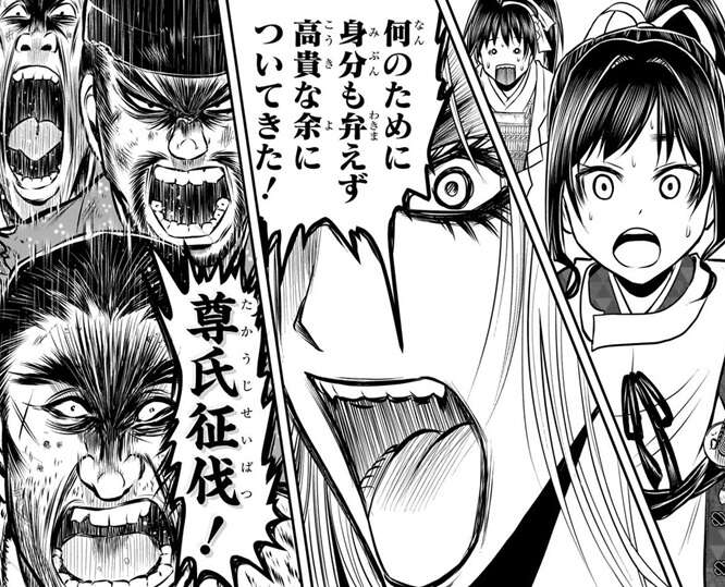利根川の戦に大勝利した時行は、顕家に顕家軍の将達を紹介してもらいます。執事の春日顕国と指揮官の伊達行朝は常識人で、時行を歓迎します。しかし結城宗広は一見常識人に見えますが、実は保科党にいたシリアルキラーの結城三十郎の父親で、この結城宗弘も三十郎と同様、重度のシリアルキラーでした。さらに南部師行もあからさまに時行を馬鹿にする、癖の強い人物です。弧次郎は南部の失礼な態度に腹を立てますが、時行は尊氏を倒す為と顕家軍の将と一から信頼を築いていこうと心に誓います。