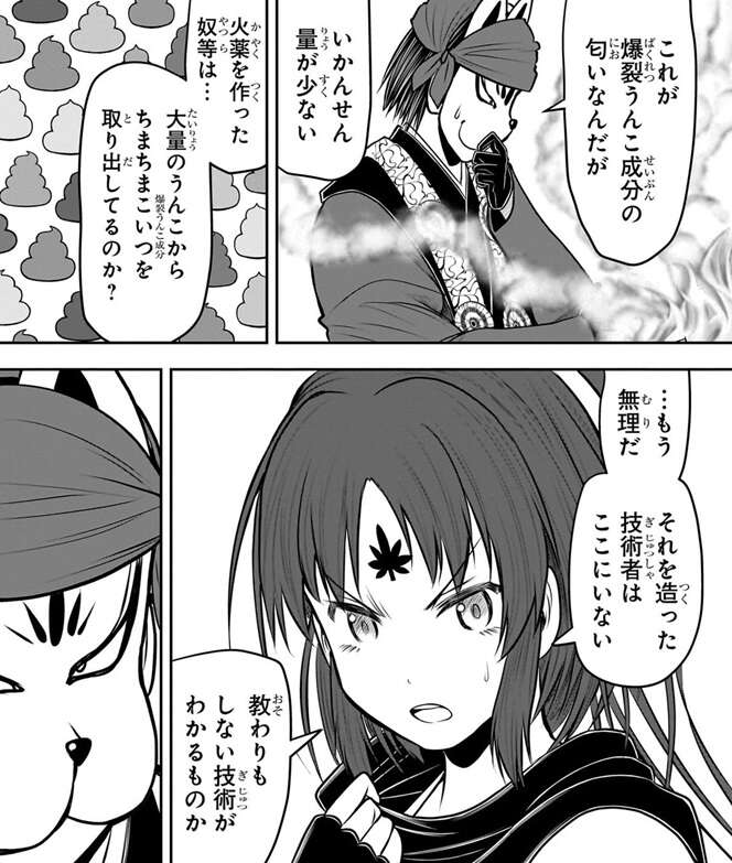 炸裂弾を自作する為、火薬を一から作ろうとする玄蕃ですがなかなか上手くいきません。火薬を燃やした時に漂う匂いから硫黄、炭、そしてうんこ由来の成分と玄蕃は推測し、ふもとの村の肥溜めからうんこを回収、資料(うんこ)を調査します。その結果、古く乾いたうんこを燃やすと、ごくたまに小さく爆ぜる事が判明、爆裂うんこ成分がある事は分かります。しかし、いかんせん量が少なく、どうやって大量に取り出すか分からず夏も諦めるように玄蕃に言います。
