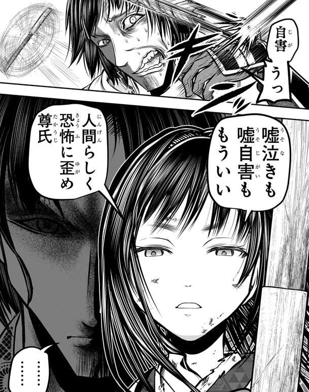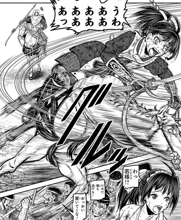 尊氏の薙刀・骨喰を腹にくらい致命傷を負った顕家は瀕死で動けず、顕家軍も満身創痍でほとんど戦えません。顕家はここが死に場所と覚悟しますが、時行には逃げるように言います。顕家との最後の別れを済ませた時行は戦場から逃げようとしますが、尊氏はまた逃げて他人を不幸にするのかと時行を挑発し、時行も尊氏の挑発に激怒し尊氏の軍に挑みます。しかし、尊氏の精鋭軍相手に勝負にならず、時行は号泣しながら逃げ始め、それを見た時行軍も戦意を失い総崩れとなります。