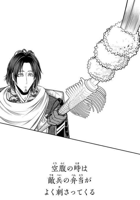 第166話では、落馬した尊氏は咄嗟に薙刀・骨喰を出すと南部が刺さっていて、南部が顕家の弓矢の盾となり、結果的に尊氏は助かりました。他でも空腹の時は、尊氏が薙刀を出すと敵兵の弁当がよく刺さっているそうです。どこまで尊氏は強運なのでしょうかね?