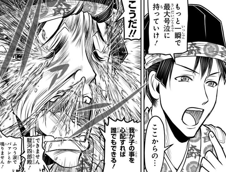 時行の号泣や恐怖による逃げ惑いは実は演技で、仁徳天皇陵に罠を敷いていて、時行の演技を信じた尊氏とその精鋭軍は罠に誘い込まれ、一転窮地に陥ります。罠を敷いた狩場に誘い込まれた尊氏軍は総崩れとなり尊氏も追い込まれ、尊氏はまたしても自害しようとします。しかし時行は噓泣きも嘘自害も許さず、尊氏を殺そうとします。