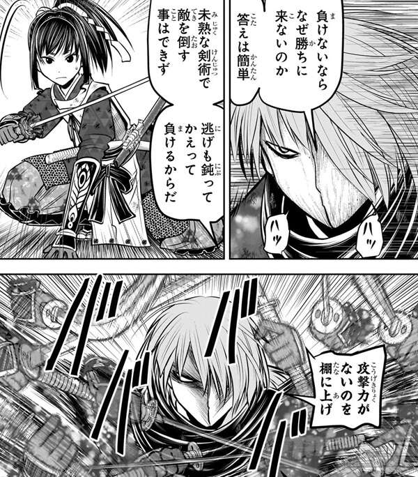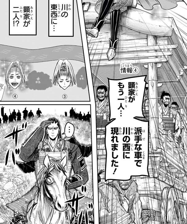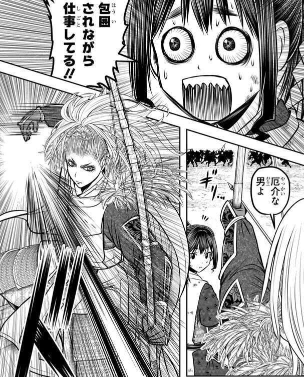 雫の策略で師直を誘き出し包囲する事に成功しますが、師直は全軍を川まで退がらせて背水の陣をとり、最後まで徹底抗戦します。さらに包囲の外の味方を呼び、包囲陣を破ろうとします。師直は包囲されても陣の中央最前線で戦いつつ、部下に尊氏の朝食の指示を出して執事としての仕事もこなしつつ、遠方から狙う顕家の弓も防ぎます。幾つもの事を同時思考でこなす師直のマルチタスクぶりに、さすがの顕家も攻めあぐねます。