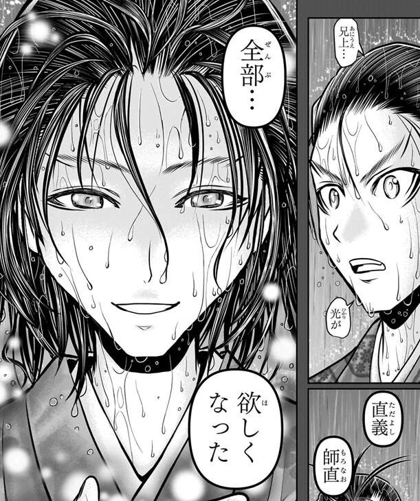 幼いころの尊氏は英傑の器を持ちながら積極性を欠き、サボり癖もあったため直義や師直達は歯がゆい思いをしていました。しかし尊氏が十四の大雨が降る日、神仏など信じない師直の目から見ても尊氏の身に神が宿ったと一目で分かるほど、突然に尊氏は圧倒的カリスマ性を持つようになります。その日より、直義、師直、師泰の意志は北条打倒と天下獲りに統一されます。