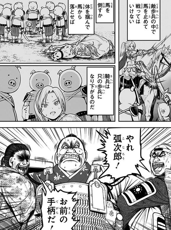 逃若党の副将・弧次郎は敵武将・和田米丸との騎馬戦に挑みますが、腕力差と体重差と相対速度の前に手も足も出ず吹っ飛ばされます。しかし、味方が油断した和田米丸を馬から引きずり下ろし、さらに弧次郎の奮闘もあり見事に和田米丸を討ち取ります。