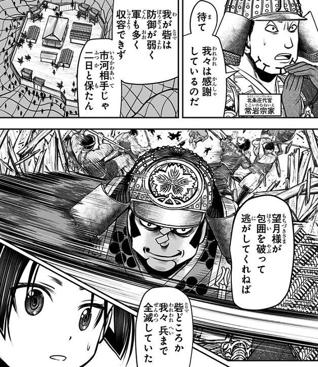 「中」の根津・保科・四宮の戦場、「南」の海野・犬飼の戦場は、すぐに国司・守護の連合軍に落とされることはないと知った時行は、「北」の望月・常岩の戦場に伝令に向かいますが、既に「北」の砦は落とされ敗けていました。望月・常岩も戦死したかと思われましたが、砦に立てこもって防御しようとしても市河相手には持たないと望月・常岩は早々に判断し、砦を捨てて兵を無傷のまま山に潜んでいました。