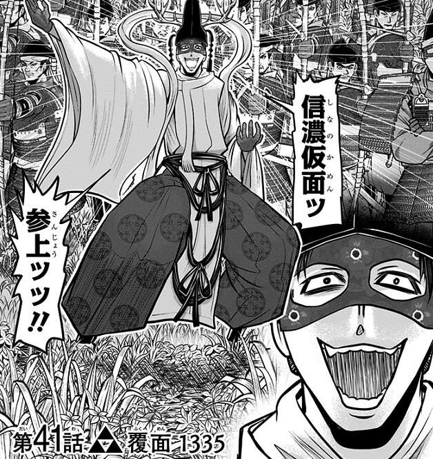 大将を配置転換し戦力を「中」の戦場に集めて、一気に保科党が勝負を決める作戦を立てて時行は作戦を伝えに「中」へと伝令に走ります。しかし、貞宗は敵の作戦を読んでいて、本体の騎馬100騎を「中」の戦場の援軍に配置します。さらに貞宗は100騎を使って伝令として「中」の戦場に向かっていた時行も捕らえようとしますが、そこに諏訪頼重(信濃仮面)が極秘の援軍として現れます。