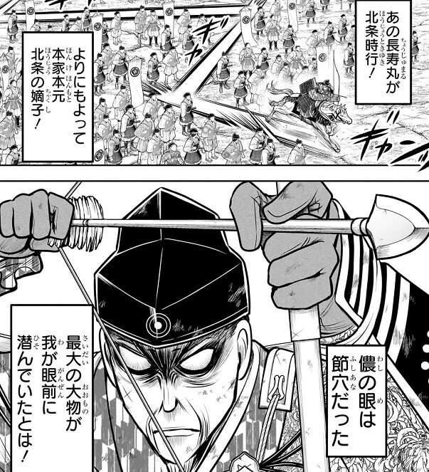 9巻では、信濃を出る前に小笠原貞宗の単騎強襲を受け、貞宗との全力の鬼ごっこを繰り広げます。さらに信濃を発った後、武蔵国 久米川・女影原で関東庇番衆 一番組筆頭・渋川や岩松、石塔と激突します。奇人・変人ぞろいの関東庇番衆ですが、全員が強者達で北条軍は苦戦しますが、どのように戦っていくでしょうか?