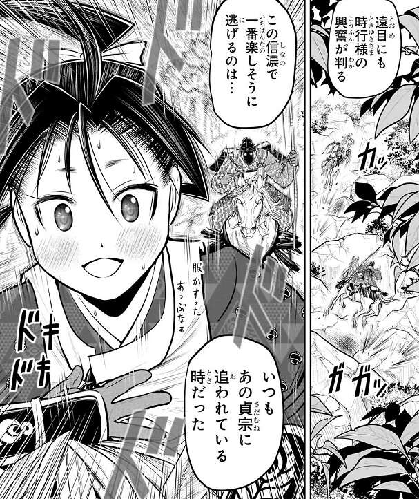 一方、貞宗に狙われた北条時行は、楽しそうに貞宗から逃げていました。北条時行が信濃で一番楽しそうに逃げるのは、いつもあの貞宗に追われている時でした。信濃を出る前の貞宗との全力の鬼ごっこにおいて、北条時行はわざと隙を作って貞宗に弓を射させて、大木の枝にぶつかるように仕向けます。