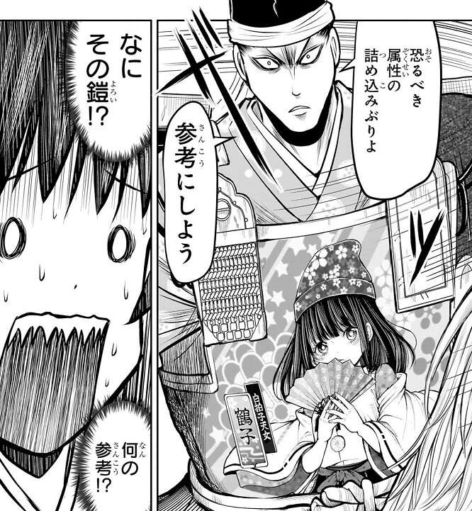 石塔は亜也子と戦いながら、彼女に質問攻めをします。石塔には理想の女神である鶴子ちゃんが脳内にいますが、亜也子の長所を取り入れてより鶴子ちゃんを魅力的にする為に、亜也子を質問攻めにしていました。岩松と一騎打ちをしていた望月は、岩松が持つ異形の大刀「艶喰」に苦戦していました。「艶喰」は元寇の際に手に入れた敵の武器の特徴を取り入れており、望月の武器は「艶喰」にすぐにへし折られてしまいます。