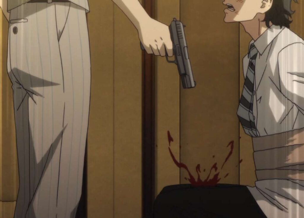 千冬は、裏切り者はオレだ、タケミっちは関係ねぇ、と稀咲に言いますが、関係ないかどうかはオレが決めると稀咲は言うと、部下に用意させた銃で武道の脚を銃撃します。