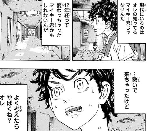 武道は最後に撮った記念写真と一緒にあった手紙の消印がフィリピンである事から、マイキーはフィリピンにいると思い、フィリピンにマイキーを探しに行きます。しかし、自分以外の東卍幹部みんなを殺している事から、自分も会った途端殺されるかもと武道も不安になります。迷いながら進んでいると、手紙に書いてあった住所からバブのエンジンを見つけた廃墟にたどりつき、そこで現代のマイキーと対面します。