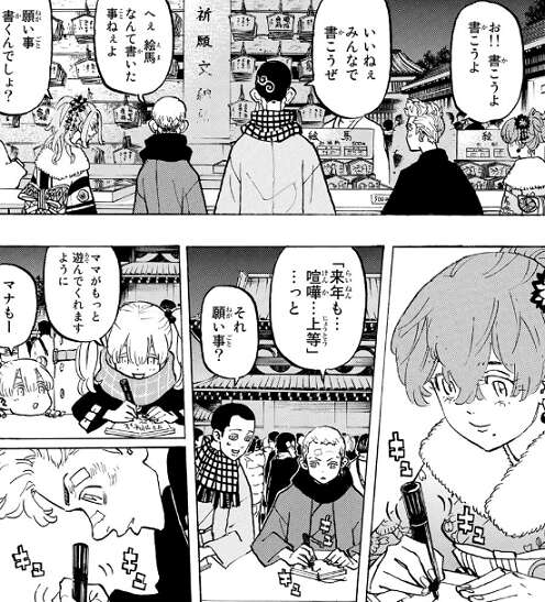 ヒナと無事復縁に成功した武道は、仲直りした時に初詣に連れていくという約束をしていて、二人は大みそかに初詣に来ています。そこに三ツ谷や八戒やその姉妹が来て、一緒に合流します。途中で絵馬にみんなで願い事を書こうという事になり、それぞれ自分の願いを絵馬に書き込みます。