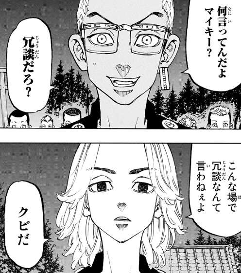 稀咲の裏切りをマイキーに報告していた事は、千冬から教えられますが、それでも一度は隊長クラスまで認められた稀咲は除名に納得できず、マイキーに詰め寄ります。半間からも稀咲が除名になれば、元愛美愛主、元芭流覇羅組が全て抜けることになる、そうなれば東卍は100人にまで萎んでしまうんだぜ?と言われますが、マイキーは構わねぇと答えます。