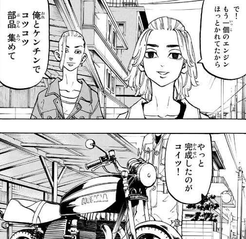 稀咲が除名、追放された全体集会から数日後、武道はマイキーに呼び出されます。マイキーとドラケンでコツコツと部品から集められて完成したバイク、CB250T、通称バブを見せられます。このバイクはマイキーのバブの双子のエンジンを使用して作られたものだと教えられますが、やっと完成したバブをマイキーは武道に贈ります。