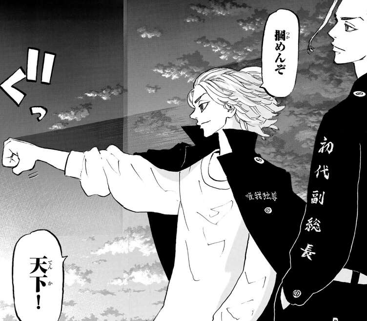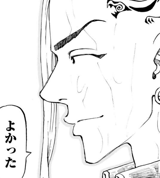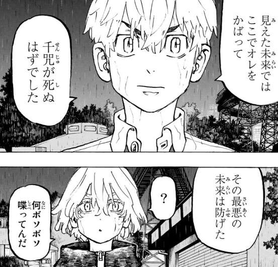 武道は六破羅単代の銃弾から千咒を守ることに成功しますが、ドラケンが身代わりに六破羅単代の銃弾を受ける形になってしまいます。武道はドラケンに少し先の未来のヴィジョンが見えることを伝え、ドラケンのおかげで千咒が死ぬはずだった未来が変わった、と武道はドラケンに言います。