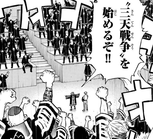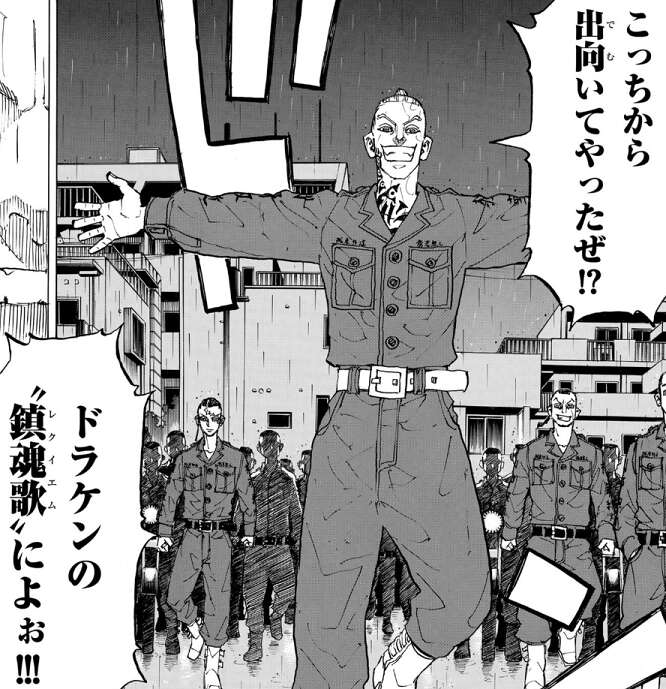 ドラケンが殺されたことで明司 武臣は激怒し、六波羅単代を今から潰すぞ、と言い出します。千咒は武臣を止めようとしますが、そこに六波羅単代のサウスがメンバーを引き連れて現れます。梵(ブラフマン)と六波羅単代の抗争がいまにも始まりそうになりますが、そこにマイキーも現れ三天のトップが集まります。