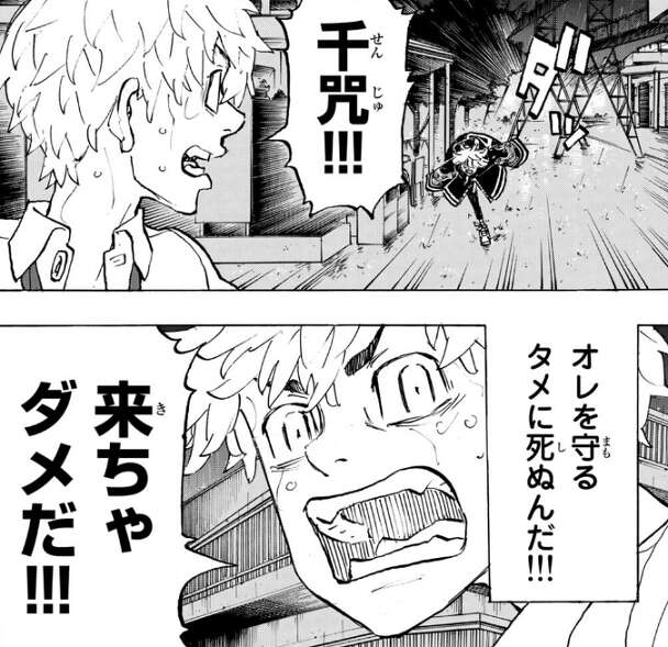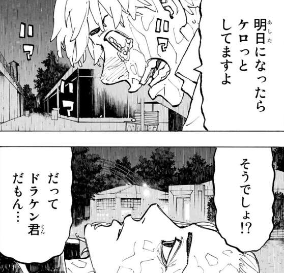倒れてしまったドラケンに武道は、救急車を呼んで千咒が従業員に担架を頼んでいる事を伝え、絶対に助かると励まします。しかし、ドラケンは自分がこのまま死ぬのだと直感し、武道に自分を責めるなよ?オマエが過去に戻ってきたせいじゃねぇかんな、とドラケンは言い武道に自分を責めないように言い聞かせます。