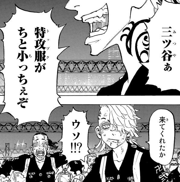 鶴蝶が三途をスパナで殴って足止めし、武道は列車のブレーキを探しますが、ブレーキを見つけられず武道は焦ります。その時、武道は自分が三途に刀で刺されるビジョンを見ます。直前にビジョンを見たおかげで武道は何とか三途の刀を避けれましたが、完全な死角からの攻撃を直前で避けられた三途は、オマエもタイムリーパーなのか…?と、つぶやきます。