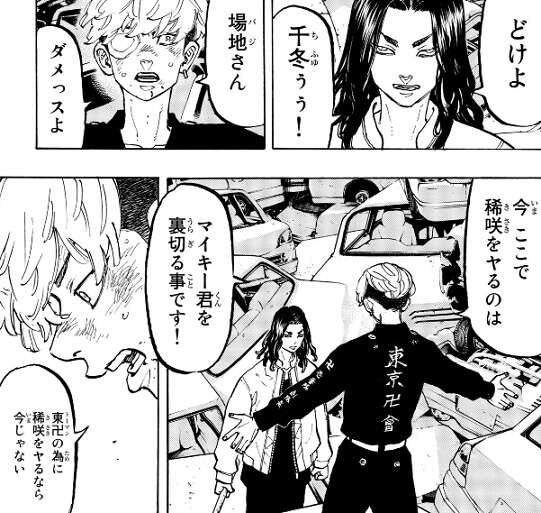 稀咲の所に行こうとしていた場地を、一虎は後ろから刃物で刺します。一虎に刺された場地を心配する武道ですが、場地の傷はカスリ傷のようで、武道に稀咲を殺るから黙って見ているように言います。色々なことが怒り混乱する武道ですが、一虎が場地を殺す未来を止めたと思い、後は自分が東卍のトップになる為に武道は稀咲を潰そうとします。