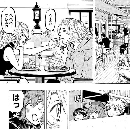 ドラケンの自宅からの帰り道、マイキーとエマが抱き合っている所を偶然、武道は見てしまい、その場にいたヒナと直人と共に二人を尾行します。エマがマイキーとドラケンに二股していると思ったヒナは、二人を問い詰めに行きますが、マイキーとエマが腹違いの兄妹である事を知ります。