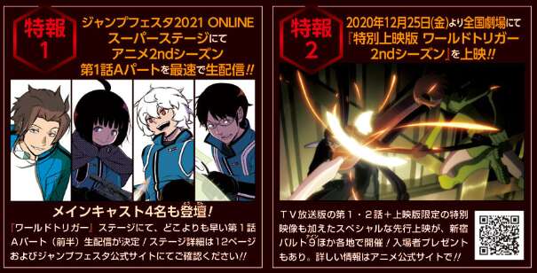 ジャンプSQ 2021年1月号より、特報1としてジャンプフェスタ2021 ONLINEスーパーステージにてアニメ2ndシーズン第1話Aパートを最速で生配信されることが決定しました。メインキャスト4名も登場するそうです。