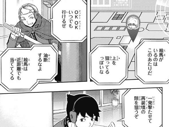 場面変わって、東隊の小荒井と奥寺は影浦隊の絵馬を狙います。一方、狙われた絵馬ですが天井越しに何かを狙っています。