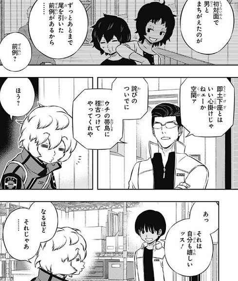 結局空閑は帯島にやらかした分を払わされることになり、帯島に影浦の「マンティス」の変化版の新技を披露します。お返しに弓場も自分の銃型トリガーによる早撃ちを見せる生真面目ぶりを見せ、最終戦に向けてお互い気合が入ります。