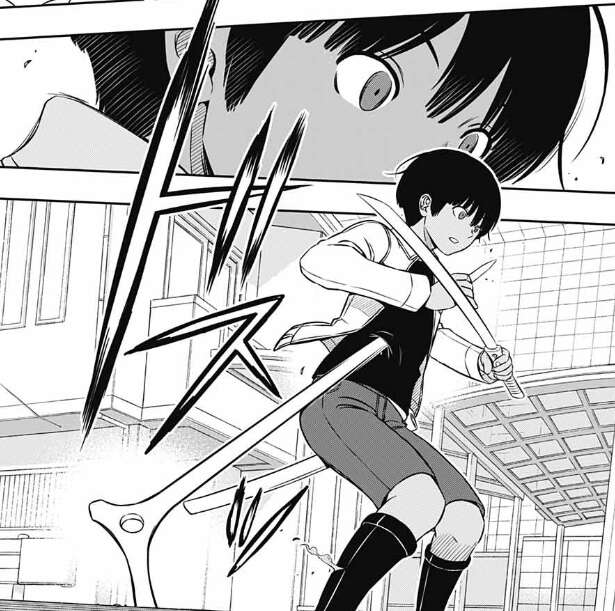 弓場は最初、「もぐら爪(モールクロー)」かと思いますが、先に投げておいたスコーピオンの刃に地面の下からスコーピオンをつなげて変形させた技でした。影浦のスコーピオンを2本つなげて使う技「マンティス」をヒントに、変化させた空閑の新技です。帯島に新技を披露し今日はこれでと立ち去ろうとする空閑ですが、弓場は払い過ぎだと空閑を引き止め空閑希望の勝負を一本だけしてやると言います。