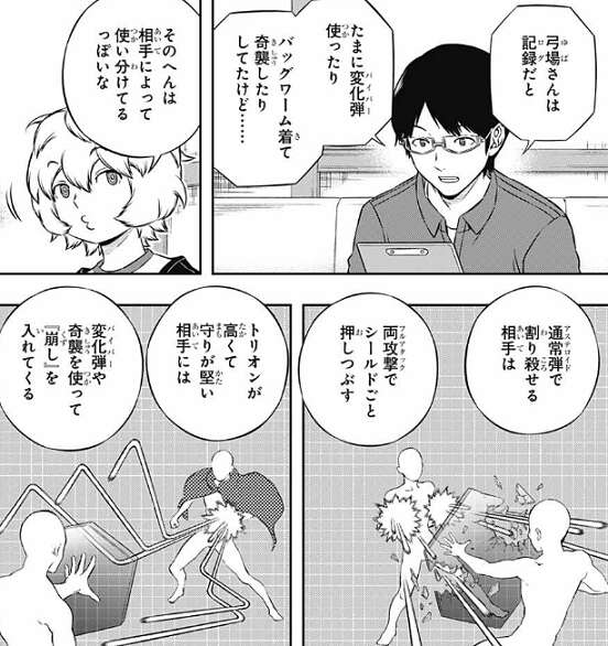 空閑が見た弓場の早撃ちはトリガーの射程と弾数を切りつめて、その分トリオンを威力と弾の速さにつぎ込んでいると空閑は分析します。他の銃手の「射程を使ってじっくり削る」という戦法と違い、1対1の近距離が得意そうです。今回空閑があっさりやられたのも、弓場が一番得意なシチュエーションだったからという可能性があると三雲は分析します。空閑は弓場対策として、分厚い壁で攻撃を防いで弾切れを狙うか、ワイヤーで相手の足を鈍らせる、弓場の射程の外で戦う、という対策を話します。