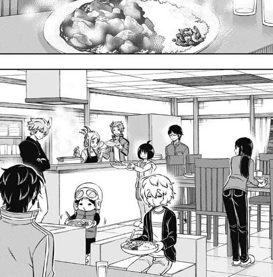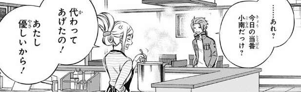 晩メシ中も、今日の訓練の続きの話をしつつ、明日以降の雨取とヒュースの連携の訓練の確認もして余念がありません。その時、小南が最終戦の解説に呼ばれている事を知り、空閑と烏丸が不安な気持ちを口にします。しかし小南は解説の経験はちゃんとあるそうで、後輩たちの失礼な態度に怒ります。