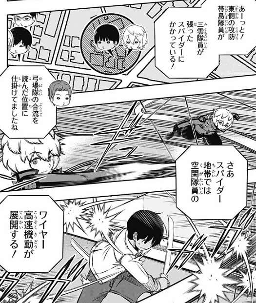 二宮隊が揃った事を知らされた帯島は何とか空閑をひっぱって行き、空閑を二宮隊にぶつけようと考えます。しかし、空閑に気をとられ過ぎてしまったため、気が付けば三雲が張ったスパイダー地帯に引っ掛かってしまいます。弓場隊の合流を読んだ位置に仕掛けられていたようで、空閑がスパイダー地帯でワイヤー高速機動で帯島に迫ります。