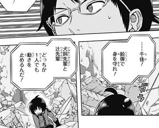 二宮の炸裂弾(メテオラ)は雨取がガードして無事でしたが、犬飼と辻に雨取を抑えるように二宮は指示を出します。犬飼と辻は雨取を狙う動きをし、二宮本人は三雲と空閑の二人を一人で相手にしようとします。