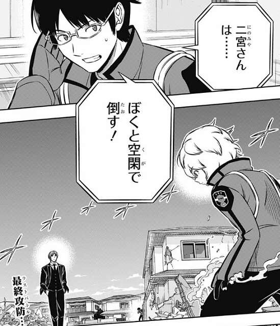 そして、二宮は自分と空閑で倒す、と三雲は雨取に言います。二宮との2対1の形での、最後の戦闘が始まります。