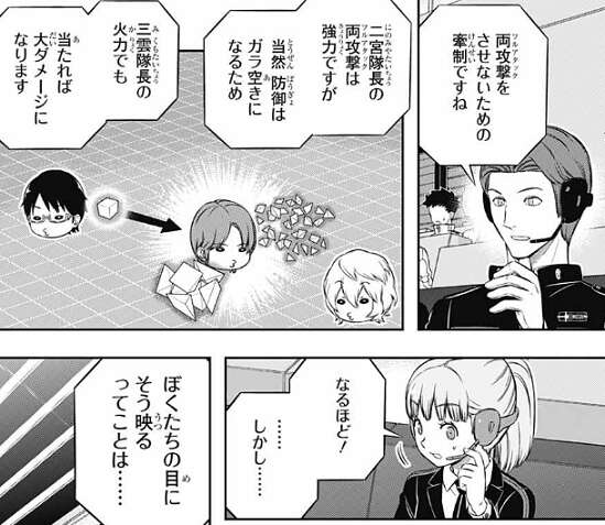 雨取という強力な切り札を、あえて切らずに場に伏せる事で二宮隊の意識を縛る、というのが三雲の作戦のようです。しかし、それもヒュースが生き残っていればの話のようです。二宮は両攻撃(フルアタック)で空閑を攻撃し、空閑は大ダメージを受けてしまいます。