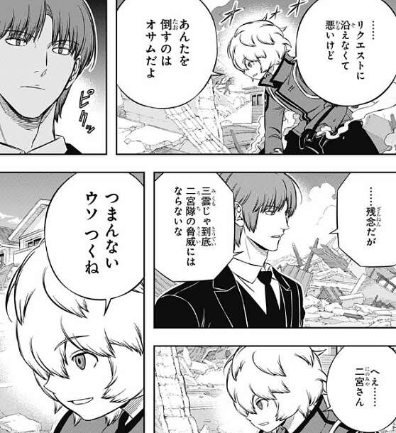三雲ではヒュースと違い警戒しなければならない「怖さ」が足りなかったようです。二宮は空閑に、雨取が人を撃てないならこの試合は終わりだ、と言い、雨取のトリオン以外に二宮隊が崩れる要因はないと断言します。しかし、空閑はあんたを倒すのはオサムだよ、と二宮に言い返します。二宮は、三雲じゃ到底二宮隊の脅威にはならないな、と言いますが、空閑は二宮に、つまんないウソつくね、とお馴染みの台詞を口にします。