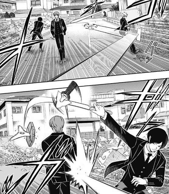 二宮隊が三雲と空閑の同時攻撃を防ぐと、今度は雨取が鉛弾(レッドバレット)で二宮を攻撃しますが、これも犬飼が左腕で直接防ぎます。雨取の位置が分かり、二宮が炸裂弾(メテオラ)で雨取を攻撃します。