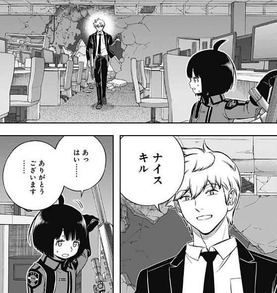 雨取の狙撃ポイントまで来た犬飼は、雨取に対してナイスキルと雨取の辻への狙撃を称賛します。雨取は素直に、あっはい…、ありがとうございます…、とお礼を言いますが、その後犬飼に緊急脱出(ベイルアウト)させられます。しかし、この先試合がどう転んでも、今期の最終順位は変わらないっぽいですけど、と犬飼は二宮に最後までやるか連絡します。